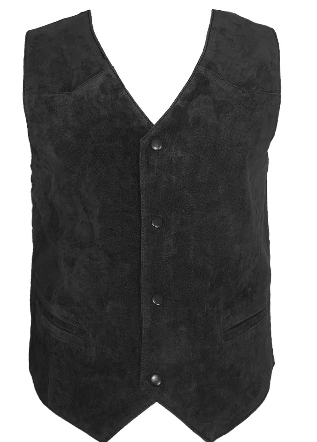 The deluxe suede vest in black is the perfect item for your Western Sheriff or Biker ensemble. The vest features snaps on the front with V stitching The full back design is made of nylon and has an adjustable tab back. Biker accessories like tattoos, chains and belts available separately. Western accessories like sheriff badges, hats, boots, spurs are available separately.